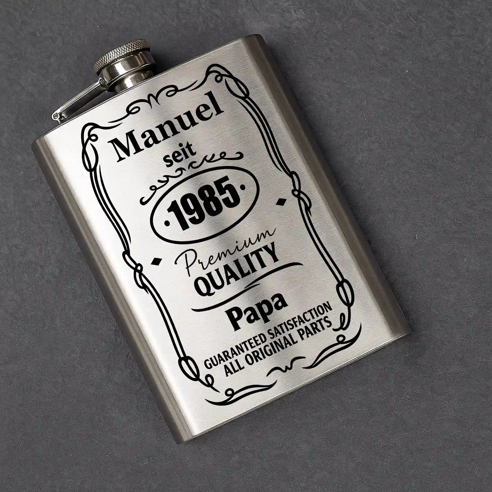 Ja, du kannst den Namen und das Jahr frei wählen. Gib einfach die gewünschten Angaben während des Bestellvorgangs ein, und wir gravieren sie individuell auf den Flachmann.