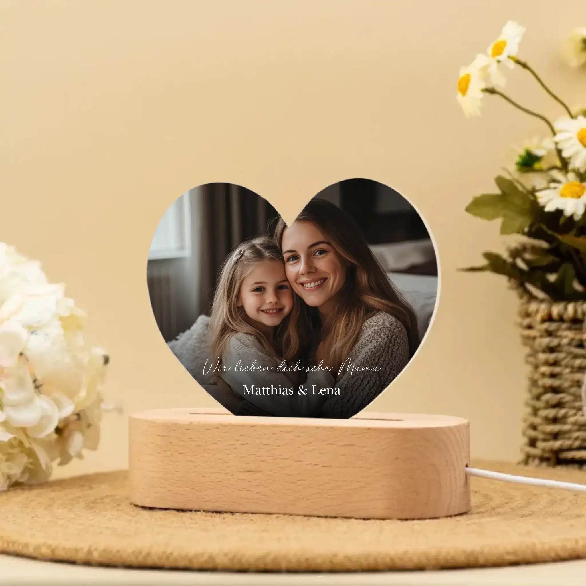 Das edle Herz-Design mit eurem Lieblingsfoto und einer individuellen Widmung wird zu einem echten Highlight. Die sanfte LED-Beleuchtung schafft eine warme, gemütliche Atmosphäre und macht dieses Nachtlicht zu einem besonderen Deko-Element.