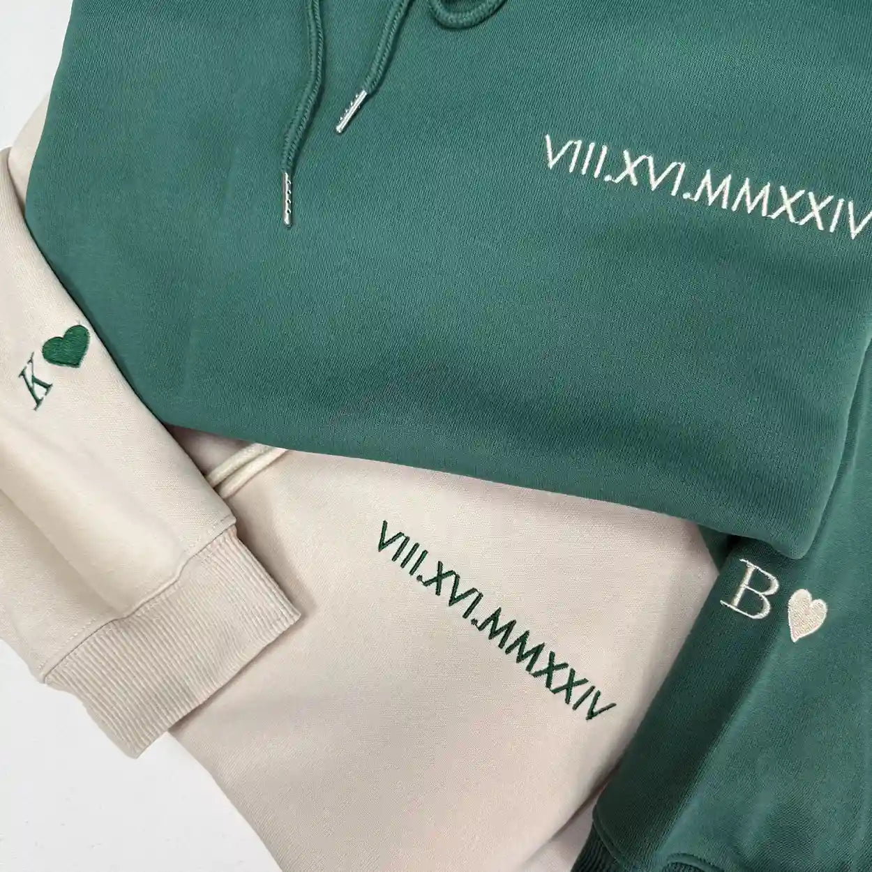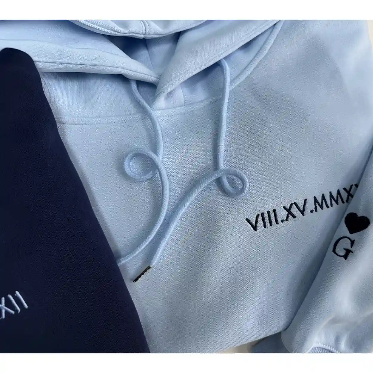 Überrasche deinen Lieblingsmenschen mit einem personalisierten Hoodie, der eure schönsten Momente feiert. Der elegante, gestickte Schriftzug in römischen Zahlen verewigt ein besonderes Datum – sei es der Jahrestag, das Hochzeitsdatum oder ein anderer unvergesslicher Moment.